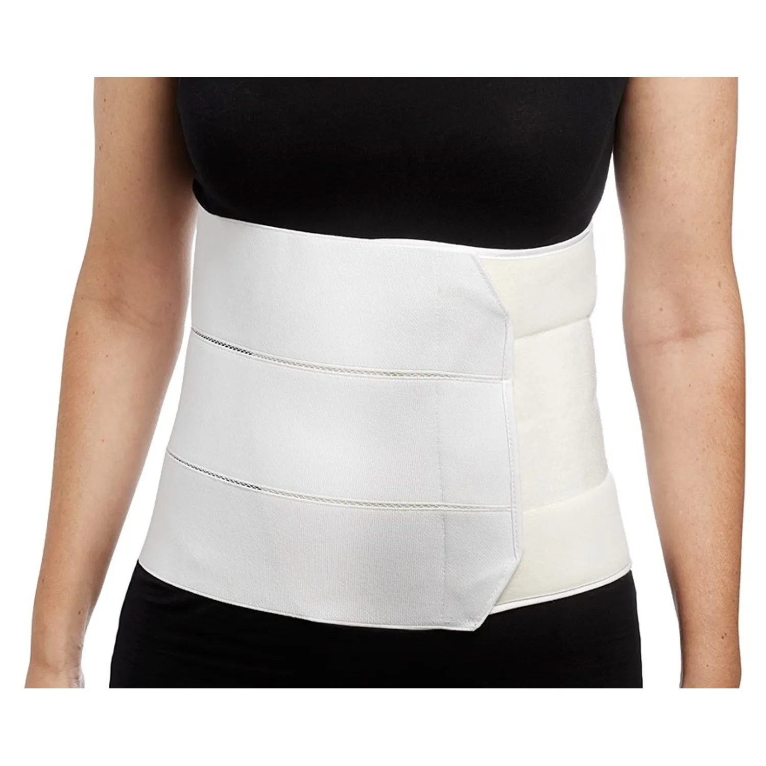 Dispositivo abdominal, confeccionado con tres bandas de elástico afelpado blanco, con algodón en su parte interna. Ajustable con cierre de contacto con fuertes velcros.