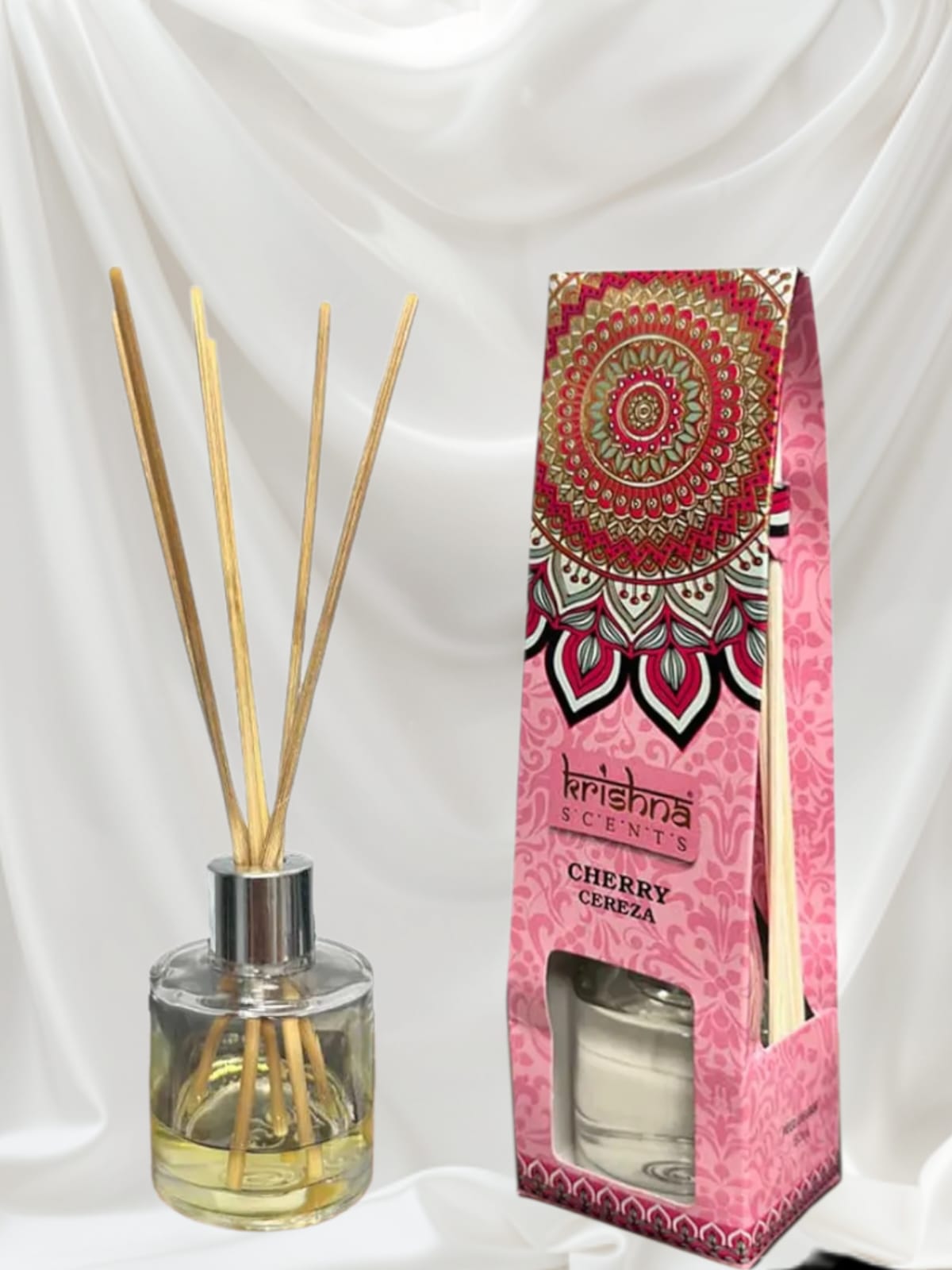 Es un aromatizador de ambiente que desprende un aroma dulce, frutal y ligeramente floral inspirado en la cereza madura. Funciona con varillas de ratán o fibra que absorben la esencia perfumada y la liberan de forma continua, llenando el espacio con un perfume suave y acogedor.